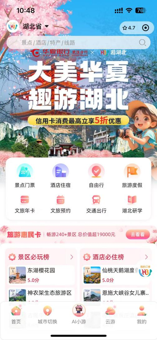 在數字化消費場景深度融合的背景下,雙方構建“三重惠民”服務體系:一是消費立減,用戶通過“游湖北”微信小程序預訂景區(qū)門票、精品酒店、特色年卡及品質跟團游產品時,使用微信支付(綁定華夏銀行信用卡),可享最高5折優(yōu)惠,單筆立減50元封頂;二是場景互通,整合省內熱門景區(qū)、優(yōu)質酒店資源形成消費矩陣;三是長效賦能,通過“月月享優(yōu)惠”機制(每自然月限享1次)持續(xù)激發(fā)消費活力。