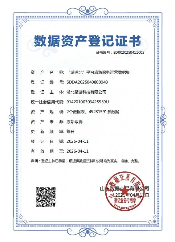 數旅集團實現(xiàn)文旅數據資源向資產入表實質性突破!近日,湖北數字文旅集團旗下聚游科技公司研發(fā)的“游湖北平臺旅游服務運營數據集”成功取得數據資產登記認證。該數據集源自聚游科技公司承建的湖北省重點文旅數字化項目“一部手機游湖北”平臺。依托平臺運營積累的海量數據,涵蓋游客行為分析、景區(qū)實時流量監(jiān)測、消費偏好畫像、文旅服務評價等核心維度。通過標準化治理、脫敏處理及合規(guī)確權,實現(xiàn)了數據資源向資產的轉型,為數據資產入表奠定了堅實基礎。